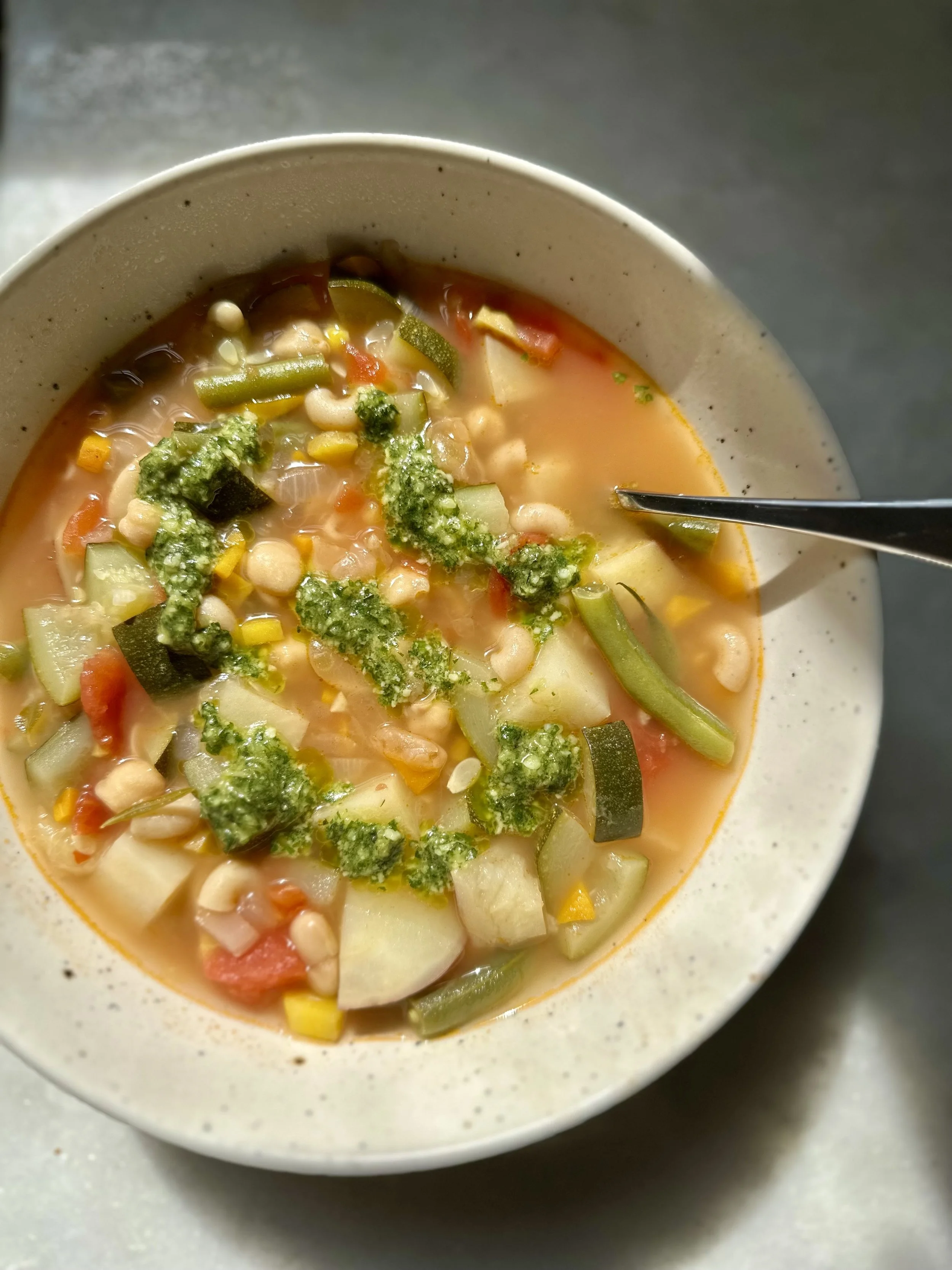 Minestrone is a soup that I make year-round and, while my take may not the most authentic (sorry Italy!), I use whatever seasonal vegetables I have on hand. In my winter minestrone, I use leeks, dark leafy greens, and other root vegetables. For this version, I use zucchini, green beans, corn, and fresh tomatoes. And my favorite part of this dish is the pistou – a French sauce, similar to that of pesto, with fresh garlic, basil, parmigiano Reggiano, and olive oil. Top the minestrone with a spoonful (or two) of the pistou and it really makes the soup sing by bringing an herby, salty brightness. In the summer, I love to incorporate as many fresh herbs into my cooking as I can and this is the perfect way to do that! As with all soups, it pairs perfectly with some toasted bread drizzled in olive oil. Happy cooking!